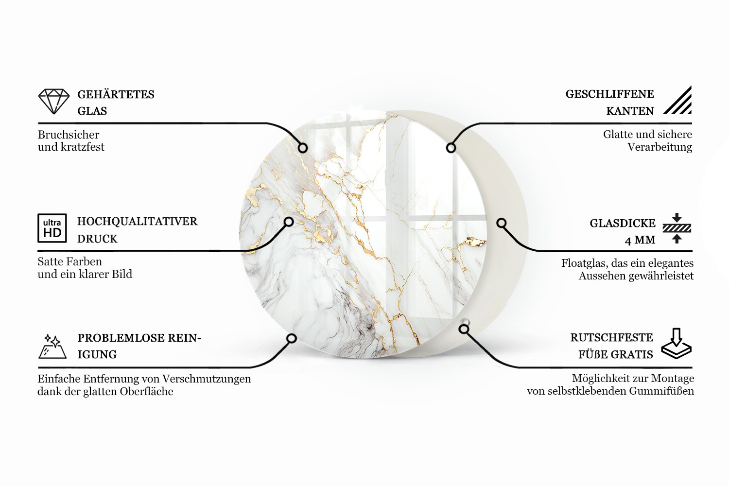 Diese runde tischplatte aus glas mit dem Motiv Kratzer auf Betonfläche ist die praktische Wahl, wenn Sie Ihren bestehenden Tisch schützen oder optisch aufwerten möchten. In Durchmessern von 50 bis 100 cm lässt sich die Glastischplatte vielseitig einsetzen – ob als zusätzliche glasplatte für runden tisch im Essbereich, als robuste Abdeckung für einen Holztisch im Wohnzimmer oder als elegante glasplatte für tisch rund im Büro.